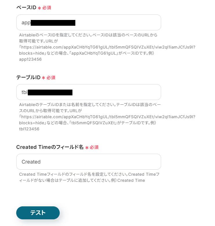 IDは対象ベースのURL(airtable.com/ベースID/テーブルID/ビューID)から確認できます。appから始まるIDです。