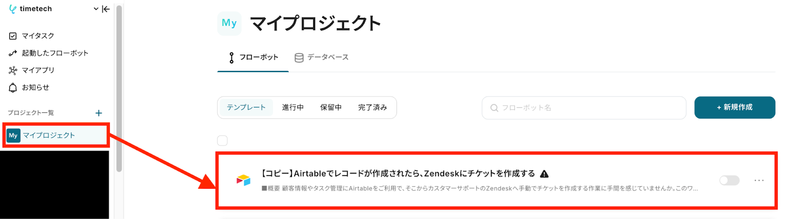 左側にあるメニューの「マイプロジェクト」から、コピーしたテンプレートを開きます。