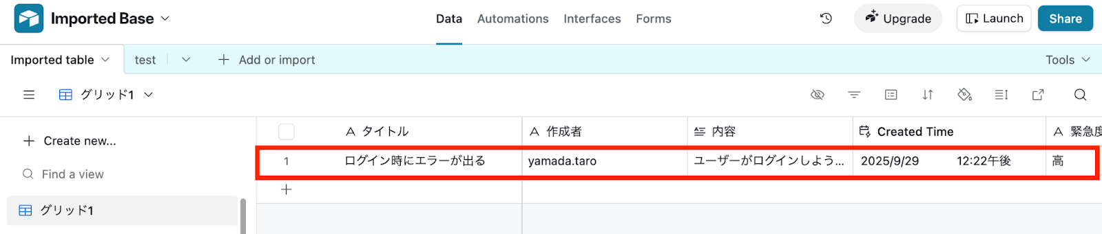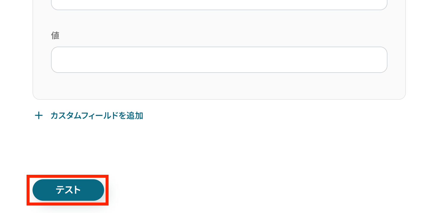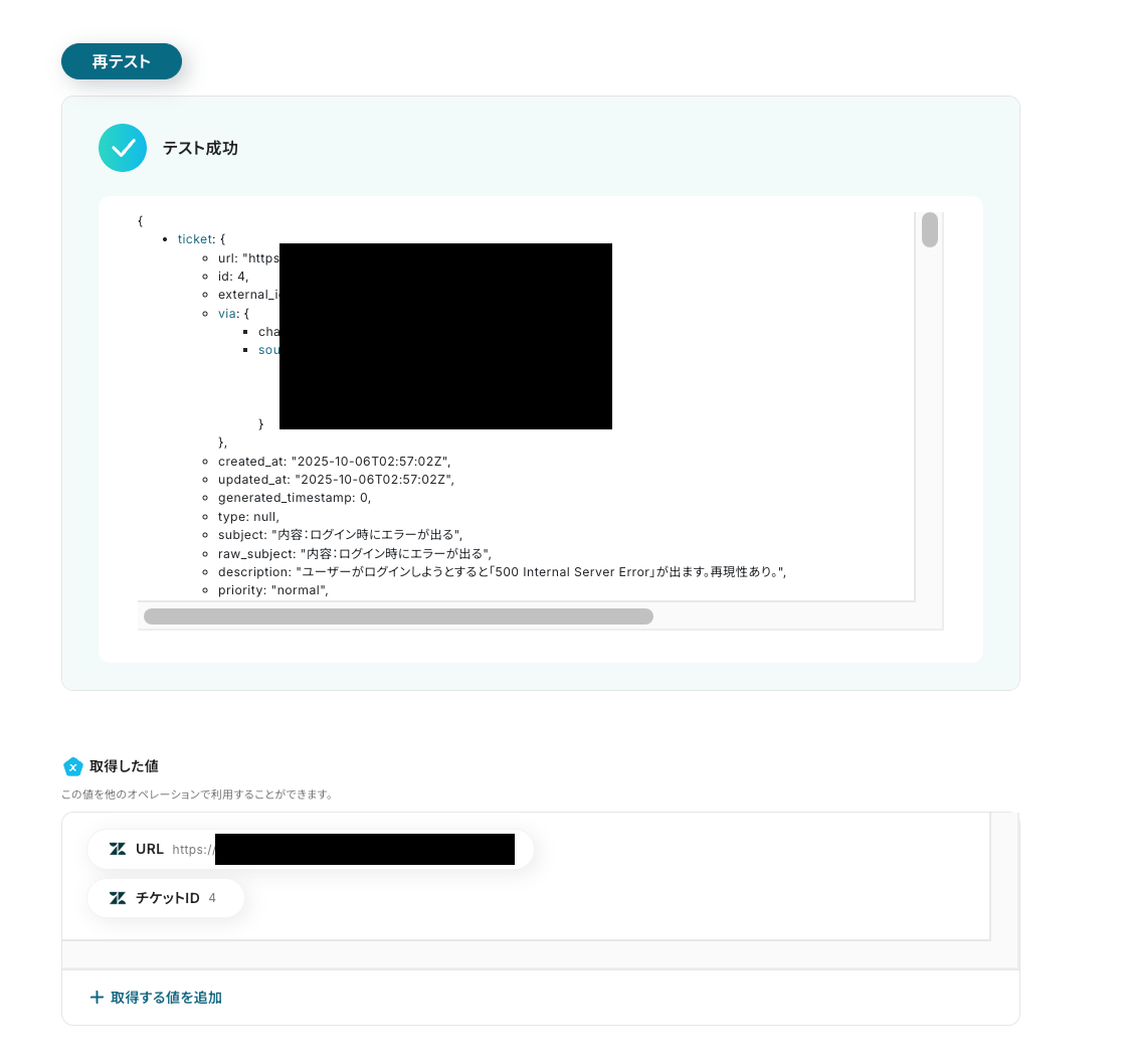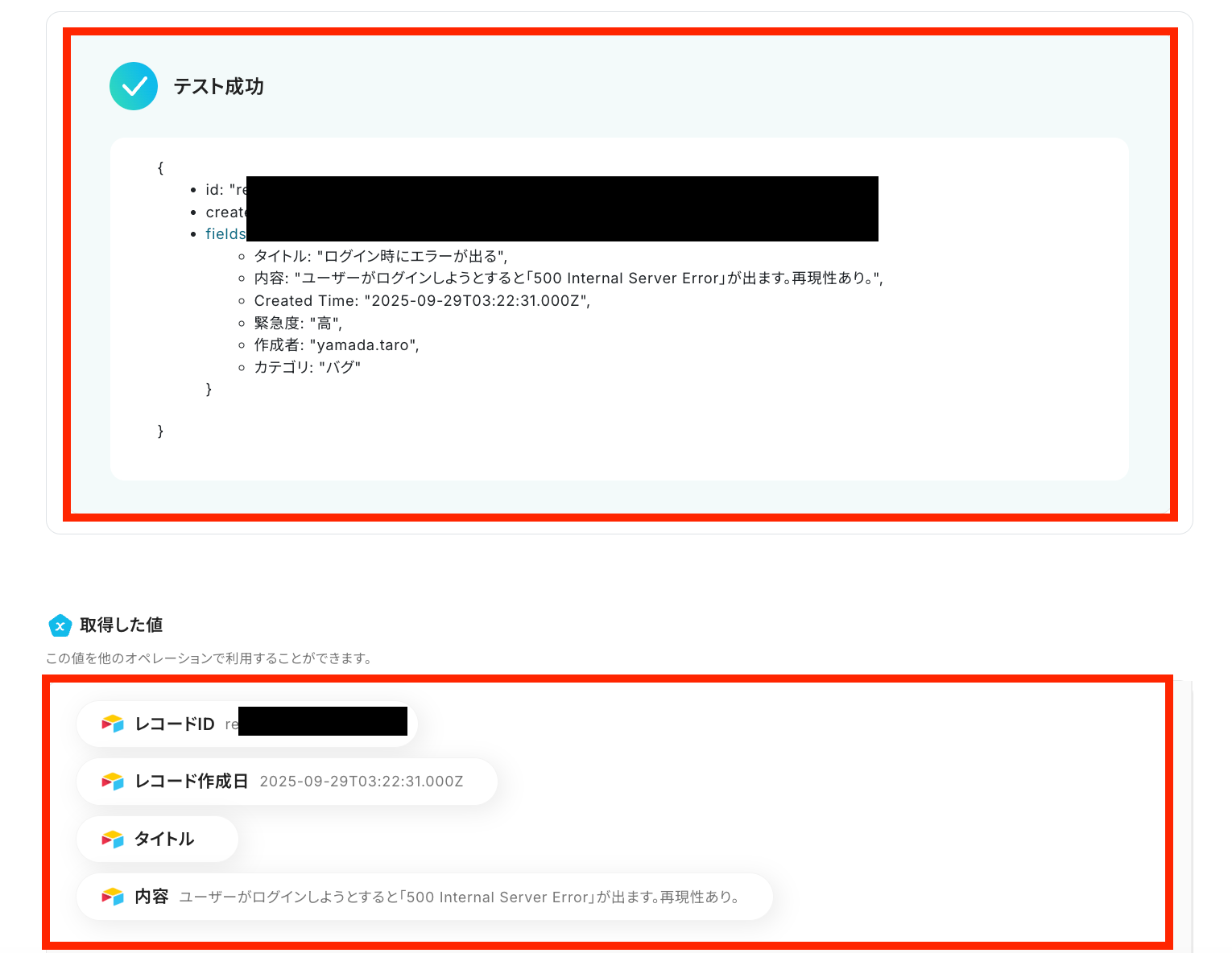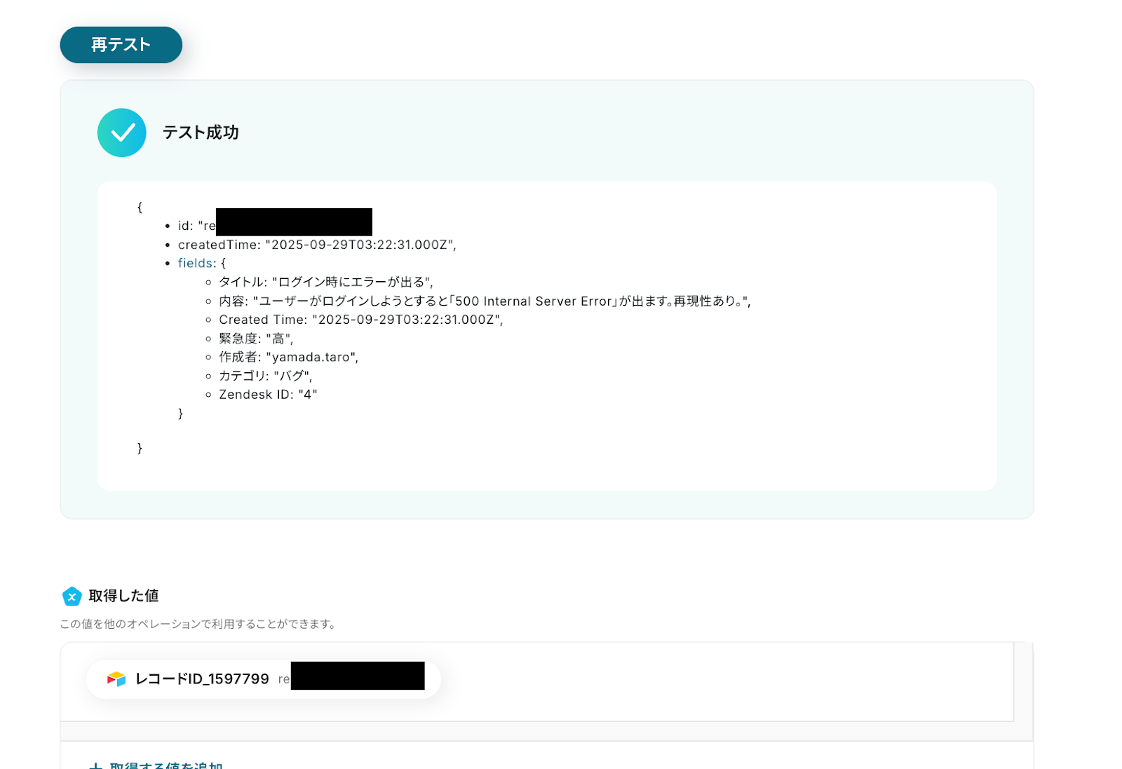 テストに成功すると「テスト成功」の文字が表示され、1番下までスクロールすると「取得した値」の欄にAirtableに登録したレコードのデータが反映されているのを確認できます。