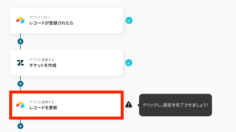 Airtableのトリガー「レコードが更新されたら」に、Zendeskのアクションを「チケットのステータスを更新」に設定すると、データの転記漏れを防ぎつつ、情報を一元管理することができます。