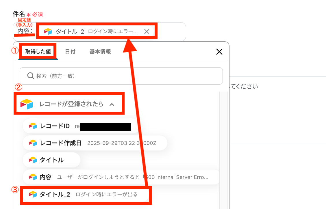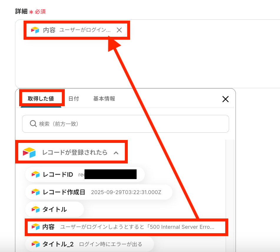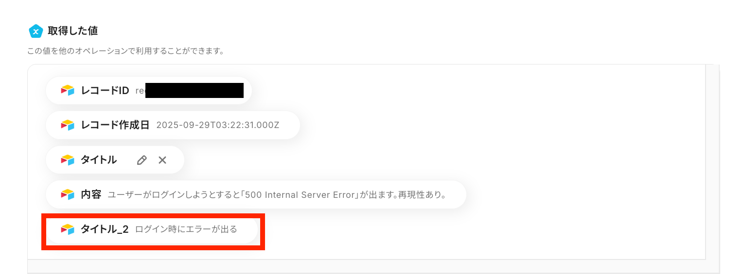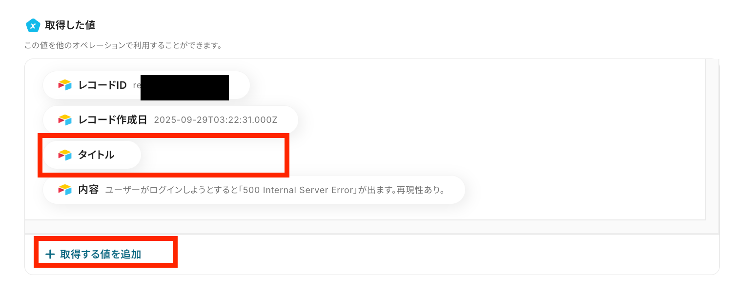 「取得した値」の欄について確認すると「タイトル」の内容が反映されていないことが分かります。