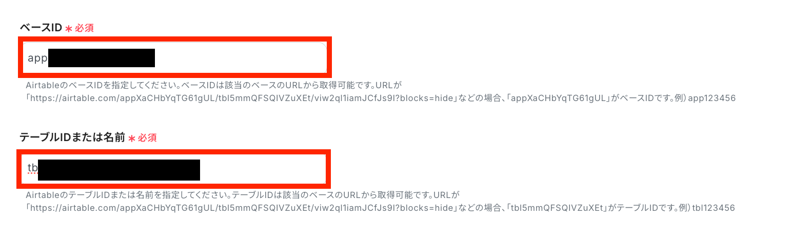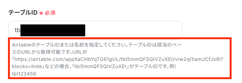 「テーブルID」もベースIDと同様にAirtableに作成したレコードのURLから取得できます。
