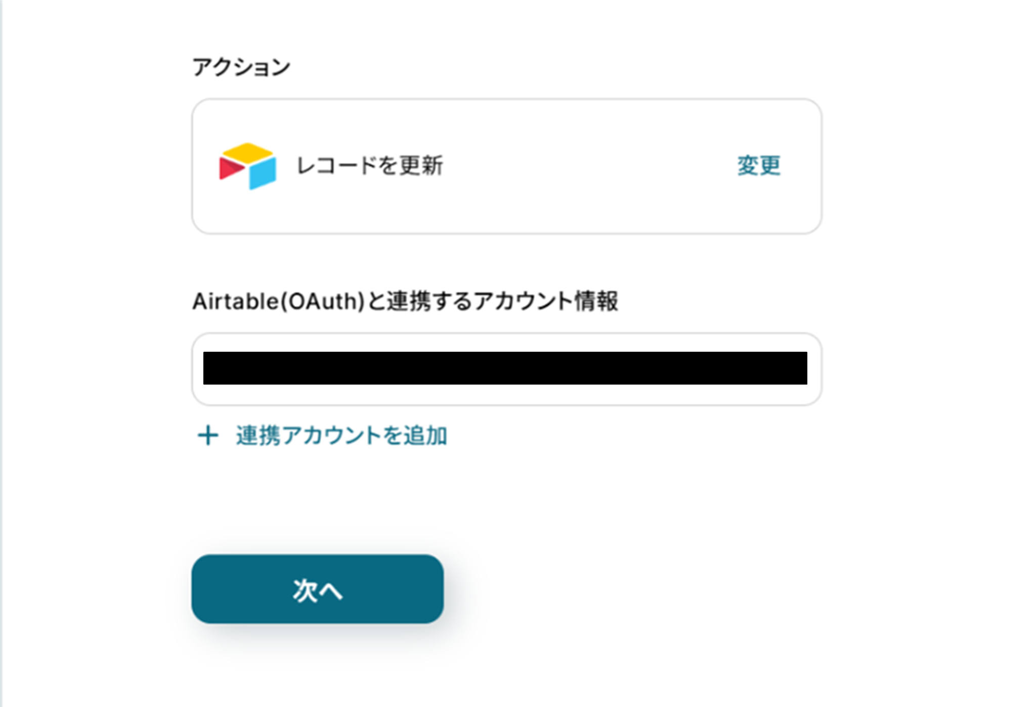 (2)「連携アカウントとアクションを選択」画面から、Airtableと連携するアカウント情報に誤りがないかを確認し、アクションは「レコードを更新」のままで「次へ」をクリックしましょう。