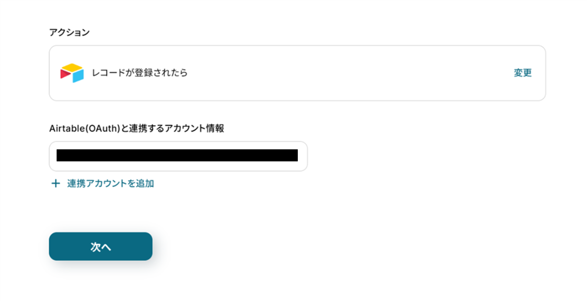 (2)「連携アカウントとアクションを選択」画面から、Airtableと連携するアカウント情報に誤りがないかを確認し、アクションは「レコードが登録されたら」のままで「次へ」をクリックしましょう。