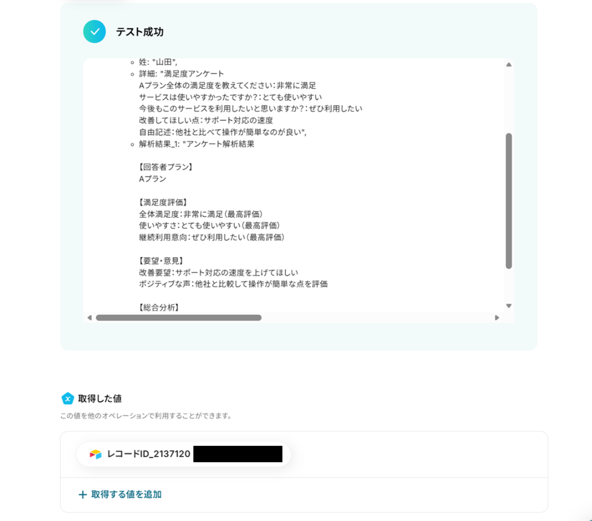 テストに成功すると「取得した値」にGoogle スプレッドシートの情報が反映されます。