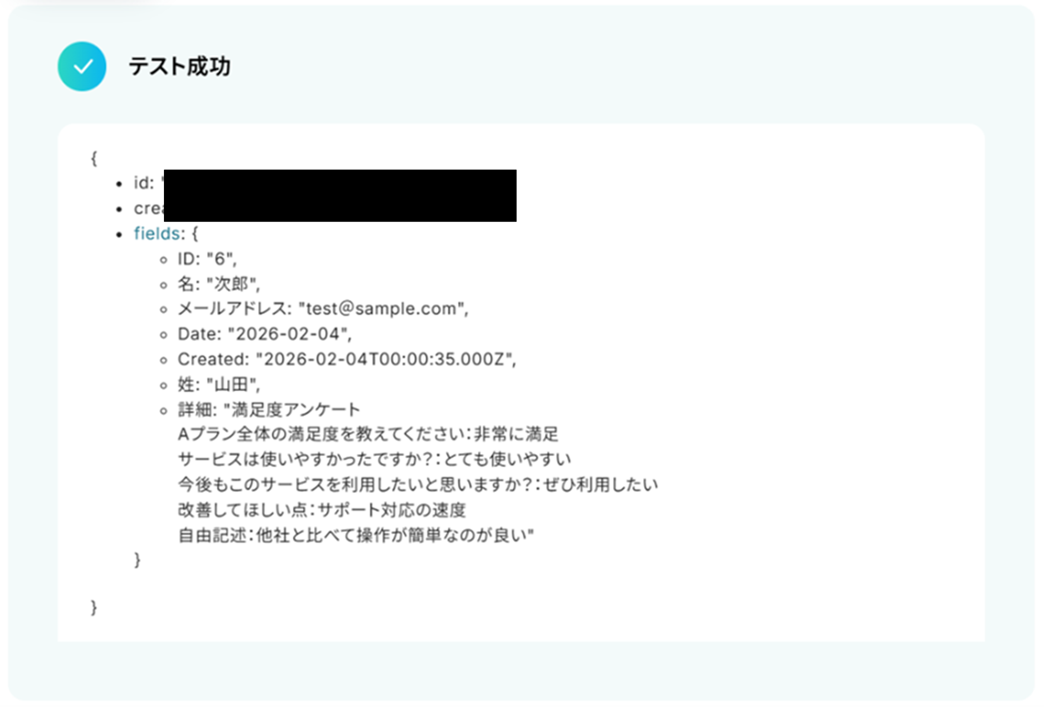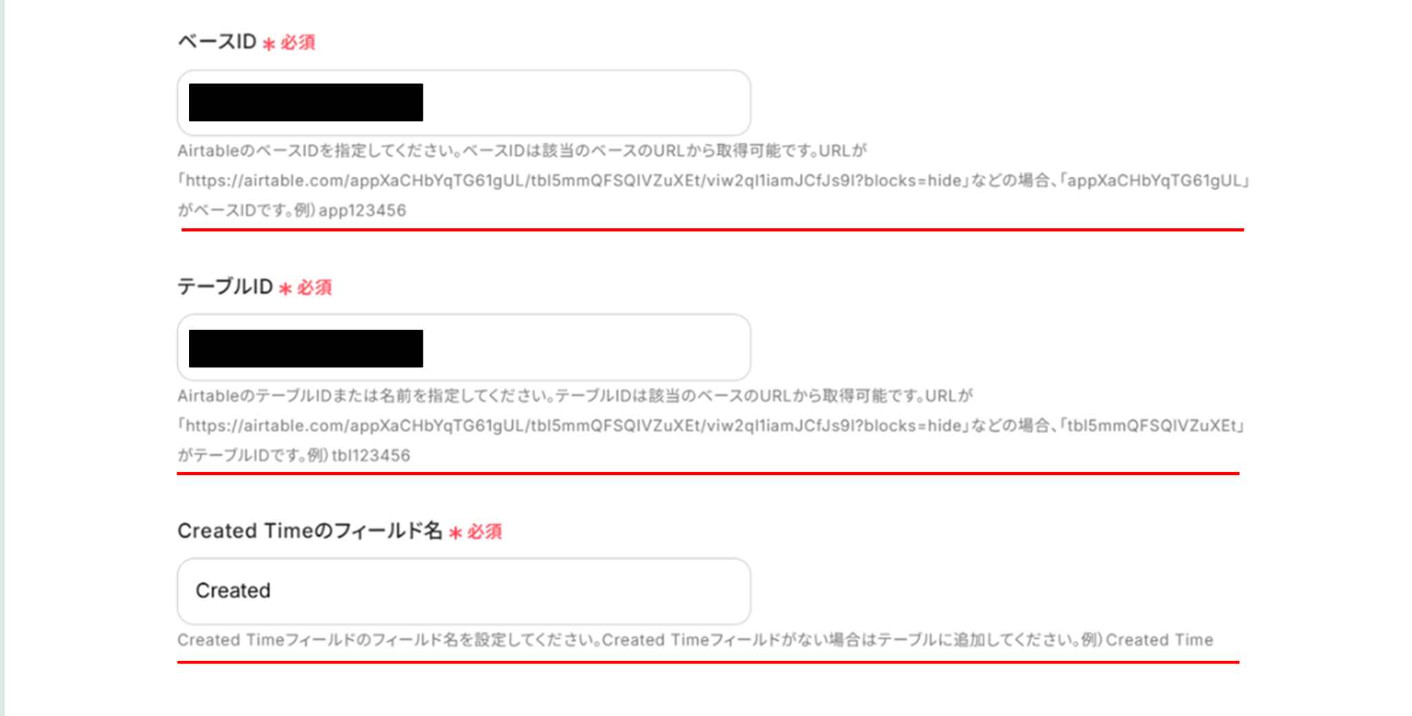 下へ進み、赤線を確認の上、ベースID、テーブルID、Created Timeのフィールド名を入力します。 入力が終わったら「テスト」をクリックしましょう。