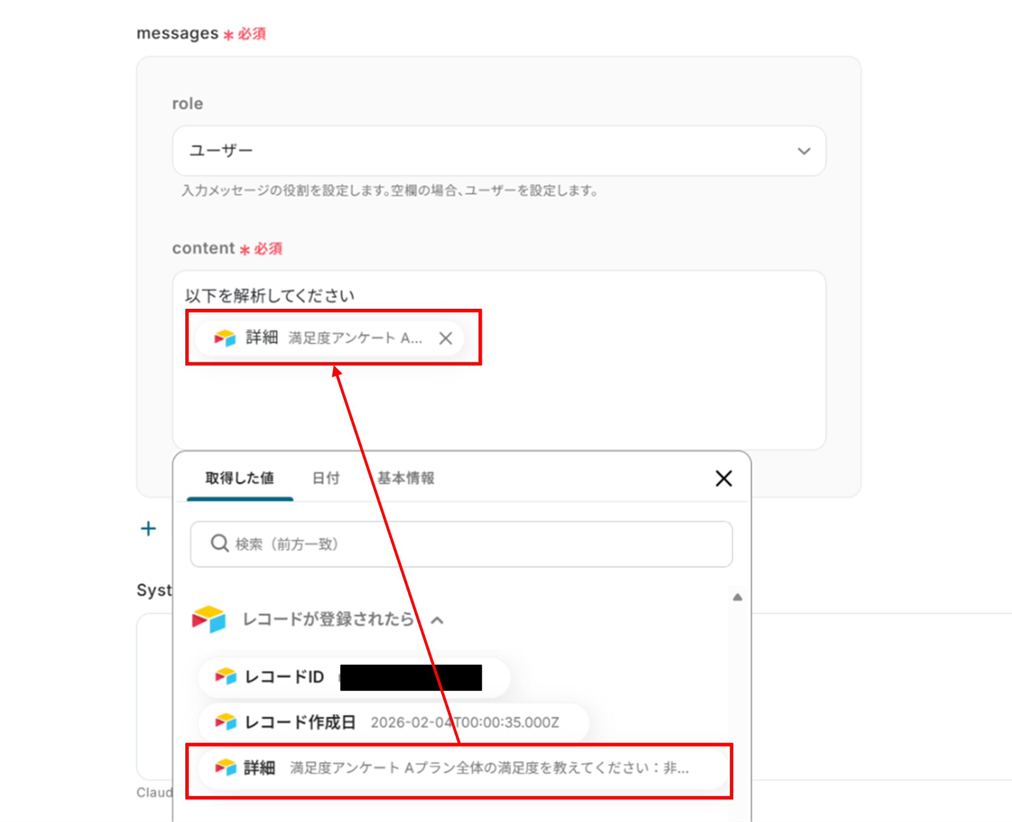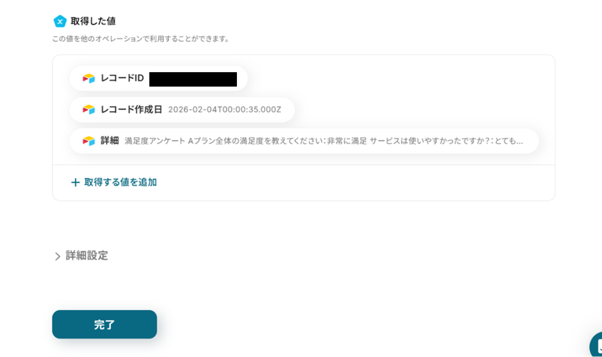 下へ進み、レコードIDは取得した値を使って入力します。