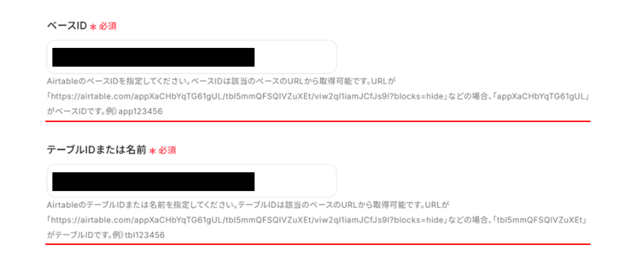 (3)赤線を確認の上、「ベースID」、「テーブルIDまたは名前」を入力します。