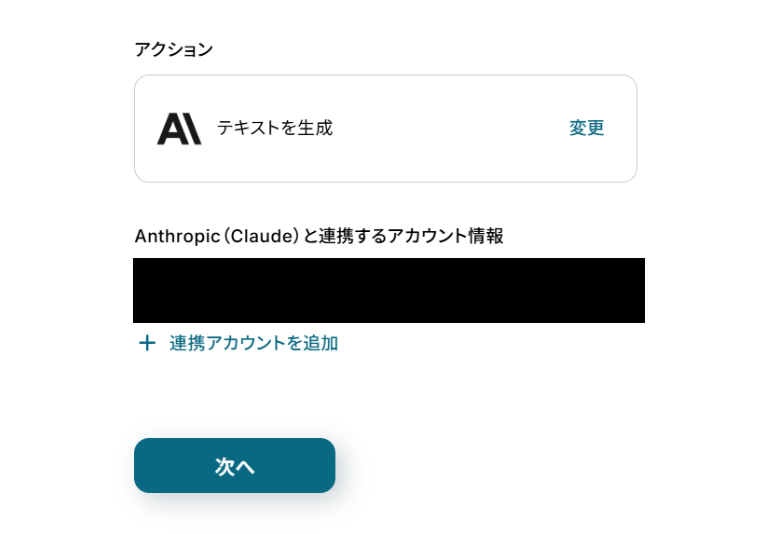(2)「連携アカウントとアクションを選択」画面から、Anthropic(Claude)と連携するアカウント情報に誤りがないかを確認し、アクションは「テキストを生成」のままで「次へ」をクリックしましょう。