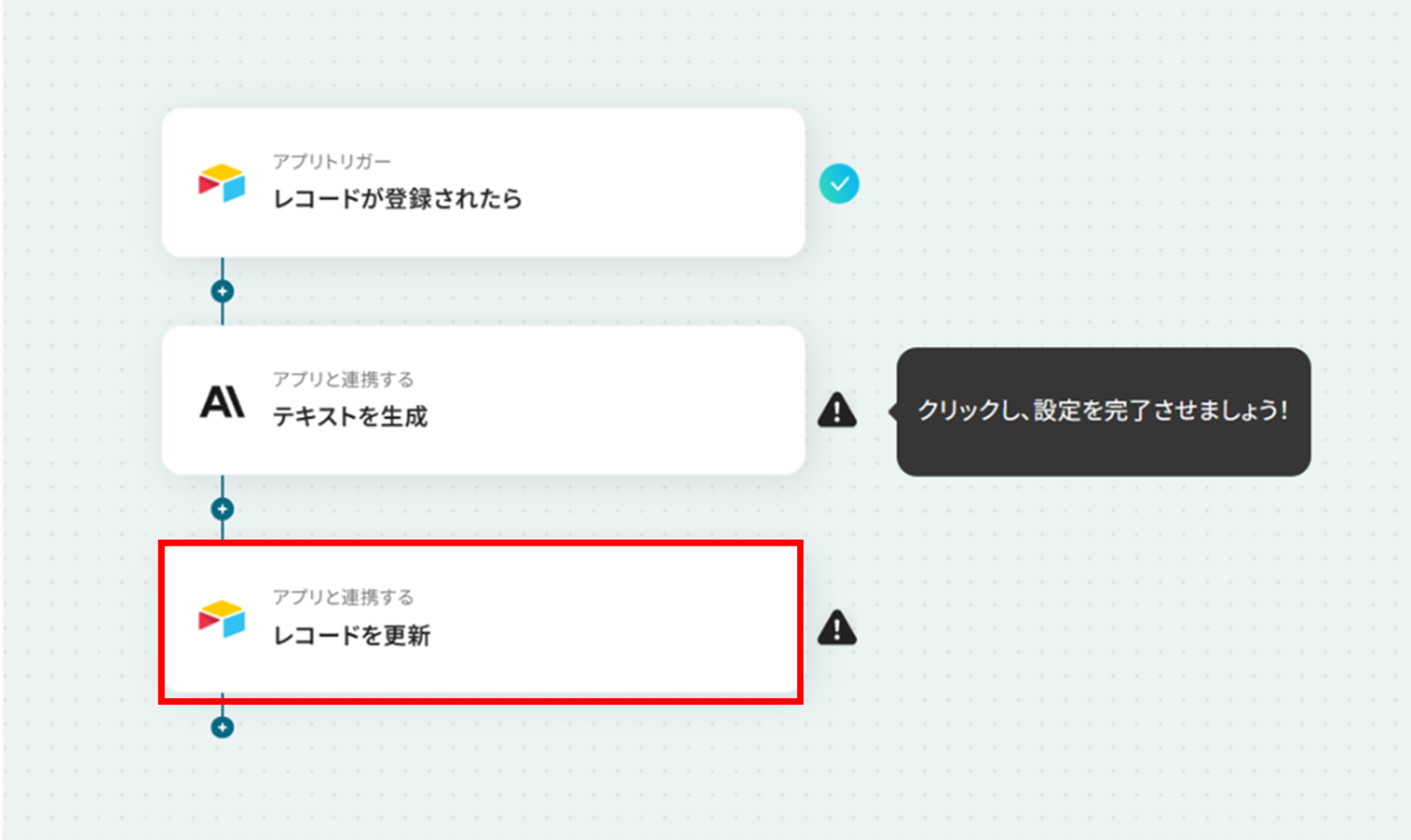 ステップ5:Airtableのレコードを更新 (1)次は、Airtableのレコードを更新します。 「レコードを更新」をクリックしましょう。