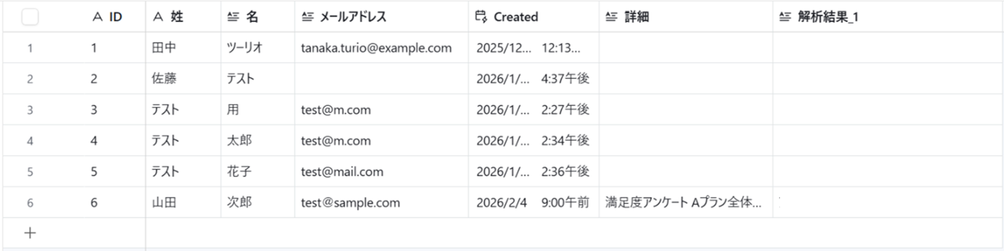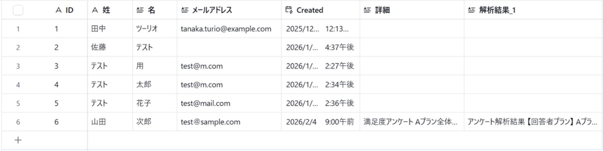 ステップ3:アプリトリガーの設定 Yoomで設定をする前に、Airtableにテスト用のレコードを登録します。 今回のテンプレートではCreated Time形式のフィールドが必要になります。