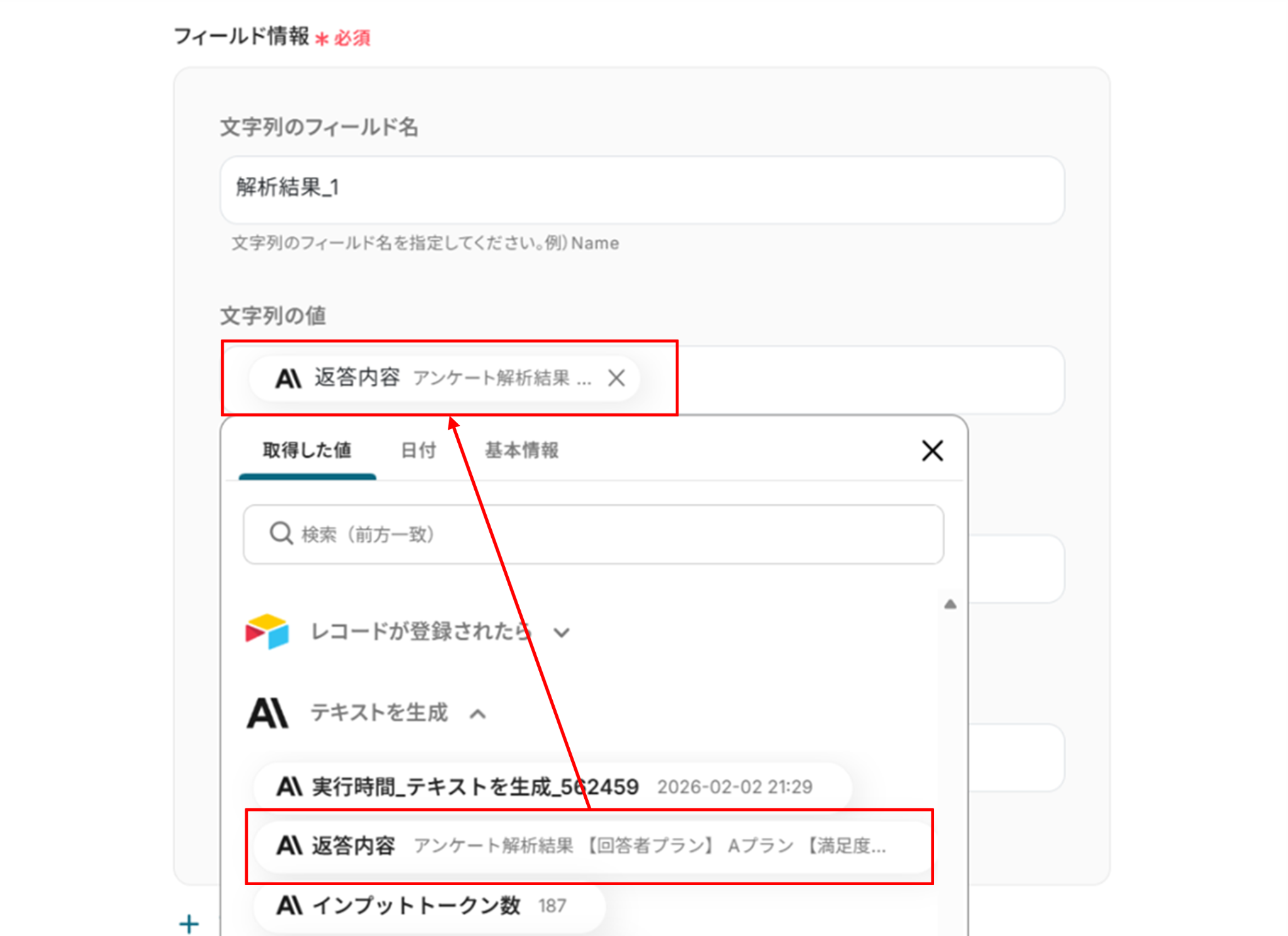 文字列のフィールド名:反映したいフィールド名を直接入力