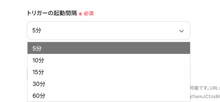 (3)「API接続設定」画面から、トリガーの起動間隔を選択します。 トリガーの起動間隔はプルダウンより5分、10分、15分、30分、60分の間隔から選択してください。