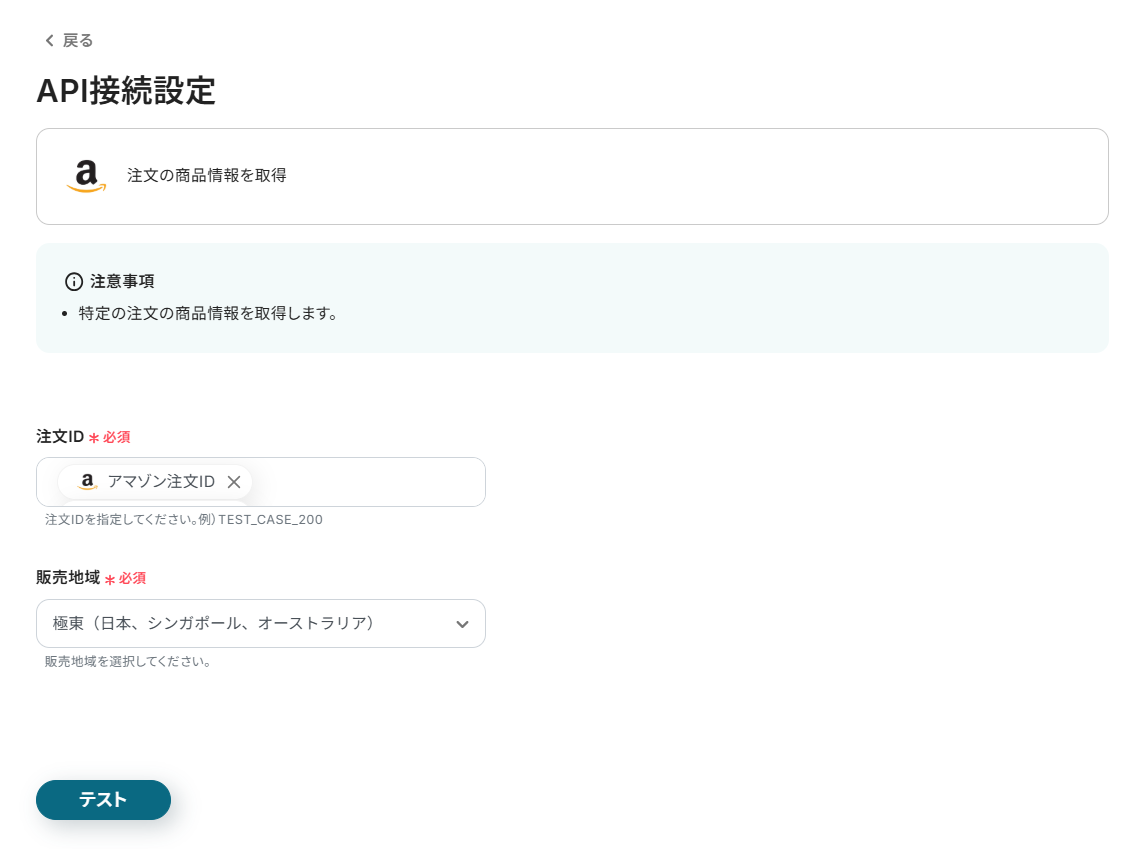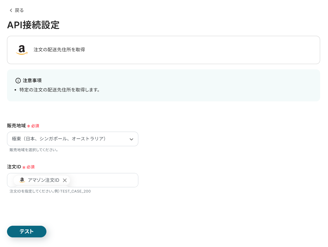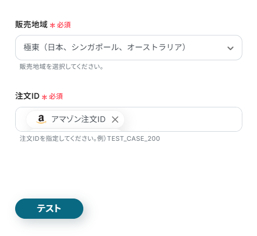 ステップ4と同様に、販売地域と注文IDを設定してテストを行いましょう。