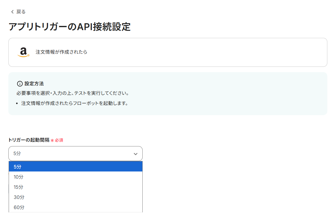 - ここで設定した時間間隔ごとに1度、Amazon Seller Centralで注文情報が作成されたかを確認します。