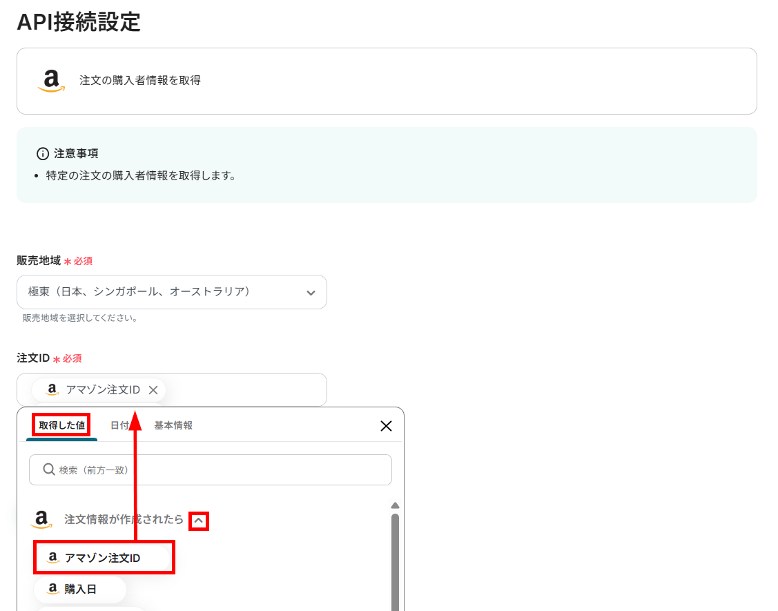 販売地域をプルダウンから選択し、注文IDを以下のように取得した値から設定してください。