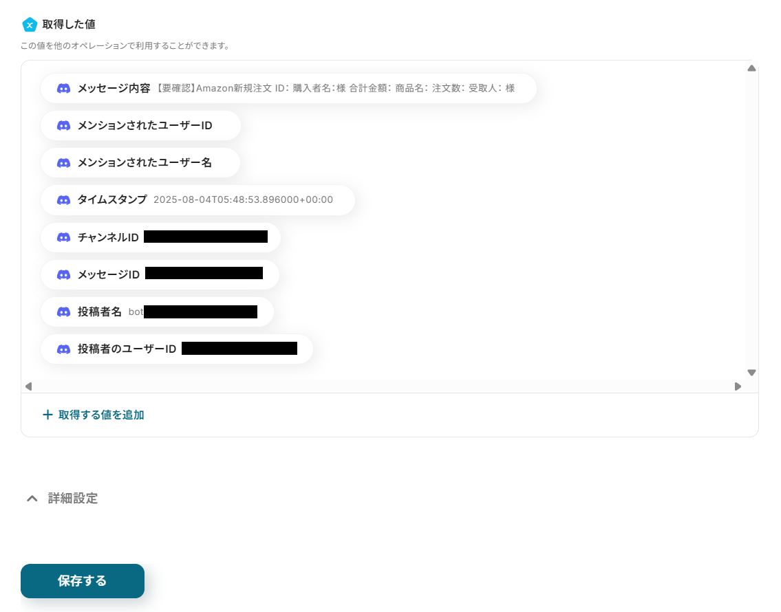 テストが成功すると、注文者情報が取得されるので、確認したら保存してください。