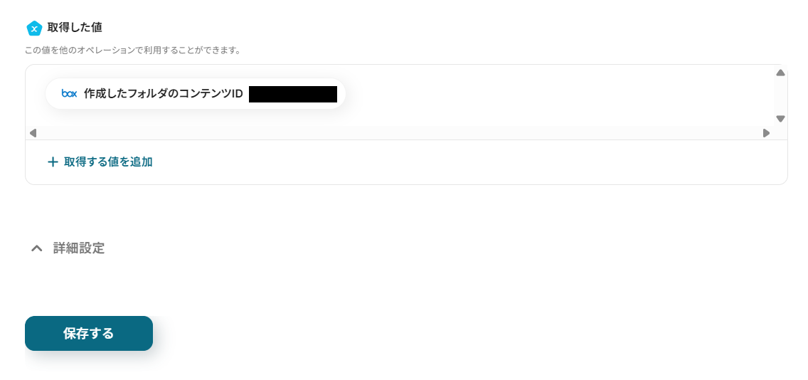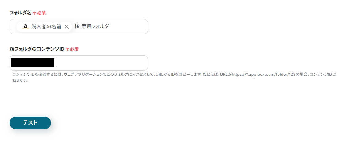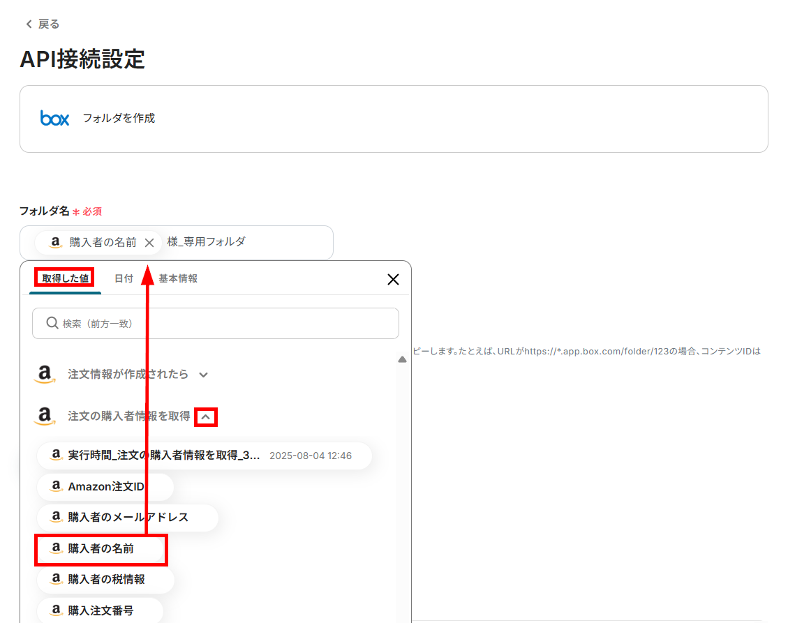 続いて、Amazon Seller Centralから取得した値を利用して、Boxにフォルダを作成する設定を行います。