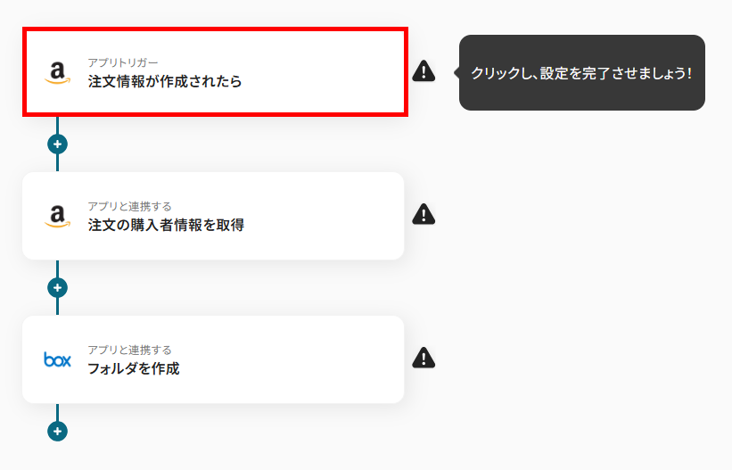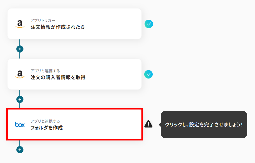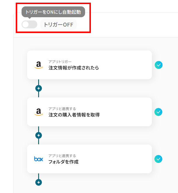 このワークフローを活用することで、Amazon Seller Centralに新しい注文情報が作成されると、自動でBox内に指定のフォルダが作成されるようになります。
