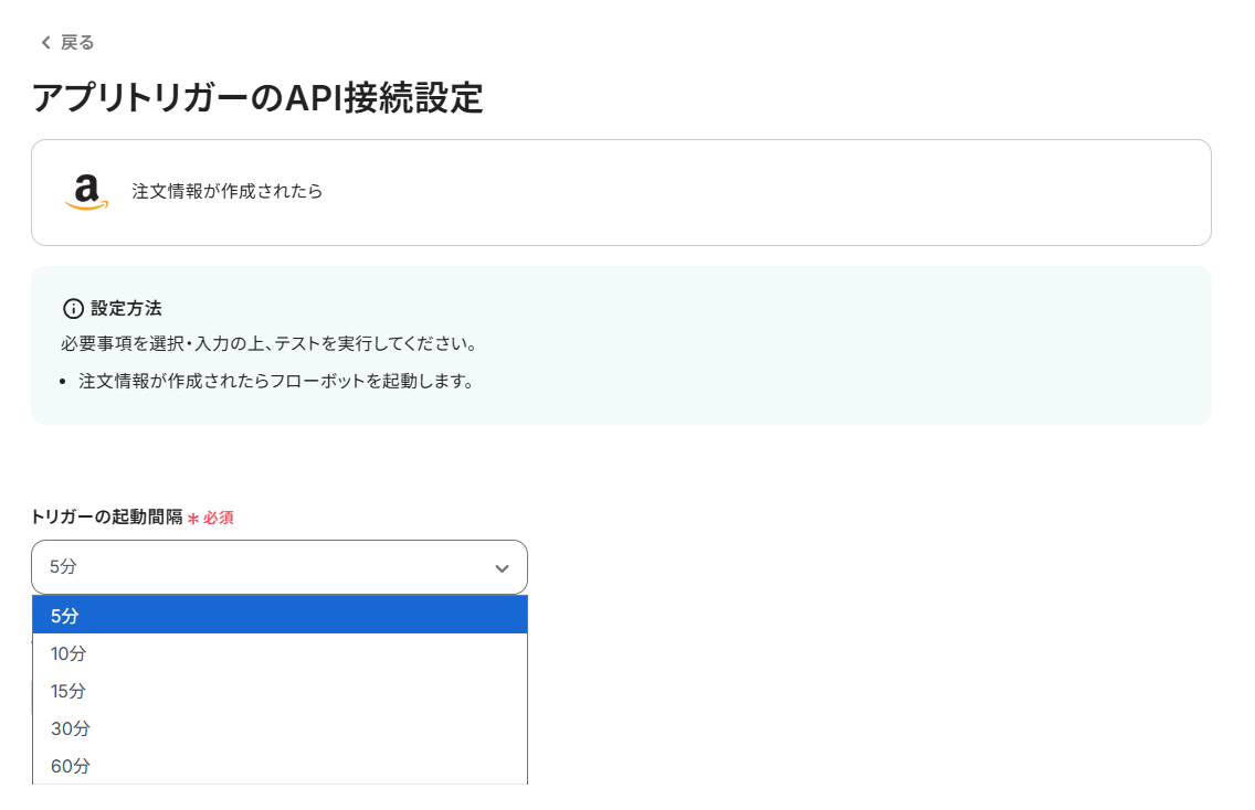 - ここで設定した時間間隔ごとに1度、Amazon Seller Centralで注文情報が作成されたかを確認します。