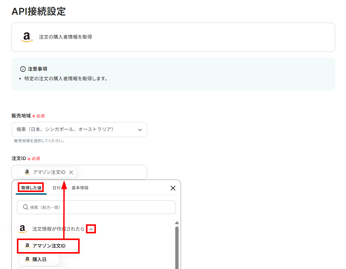 販売地域をプルダウンから選択し、注文IDを以下のように取得した値から設定してください。