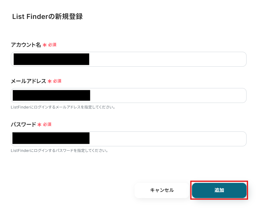 次の画面で、必須項目を入力し、「追加」をクリックしましょう。