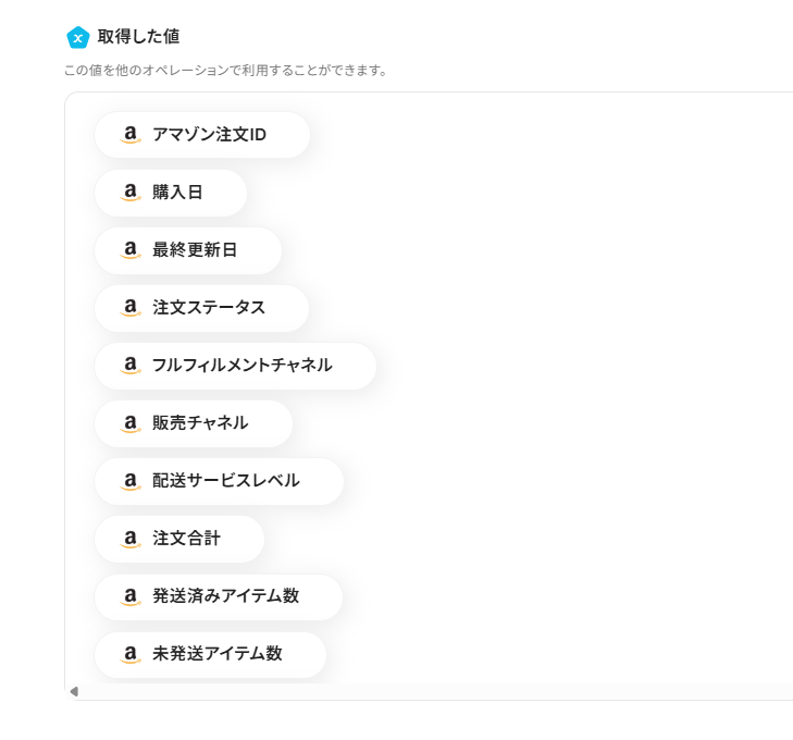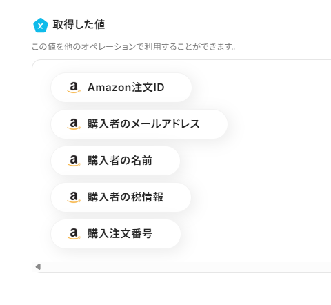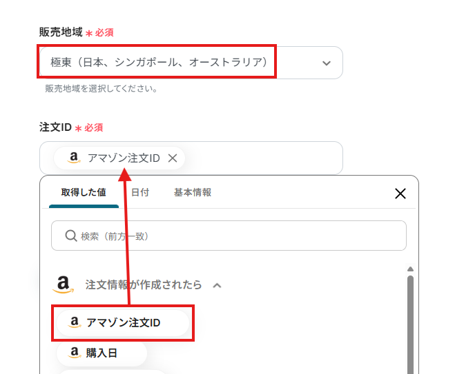 「注文ID」は、入力欄をクリックして表示される取得した値から選択してください。