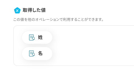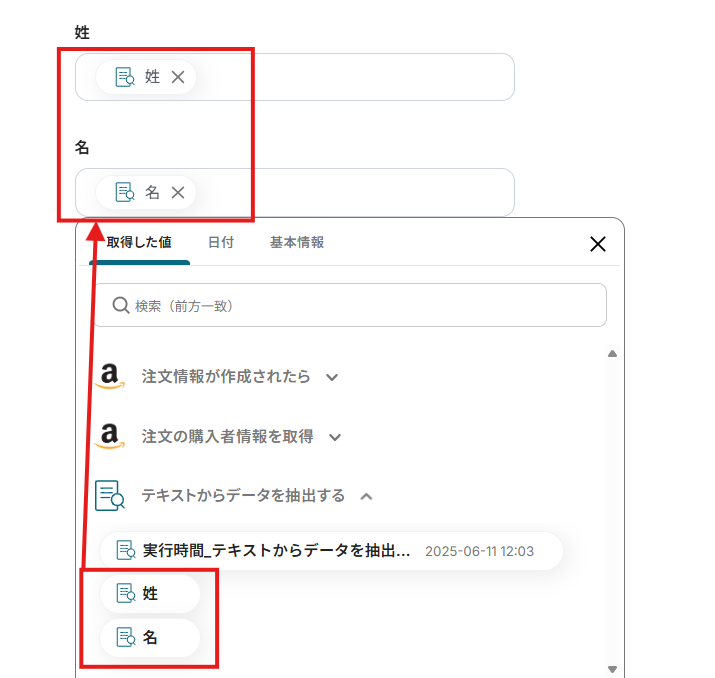 「姓」「名」は、入力欄をクリックして表示される取得した値から選択してください。