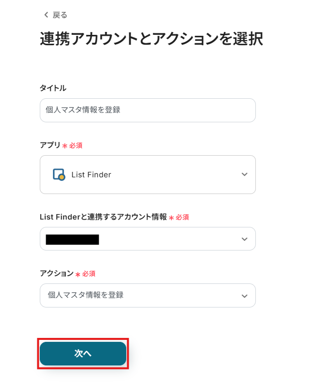 連携するアカウント情報には、ステップ1で連携したアカウント情報が反映されています。トリガーアクションはそのままにして、「次へ」をクリックしてください。
