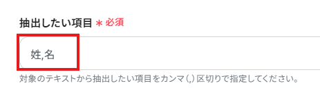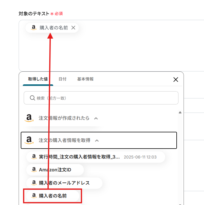 「対象のテキスト」は、抽出対象のテキストを設定します。入力欄をクリックし、先ほど取得した値から選択してください。