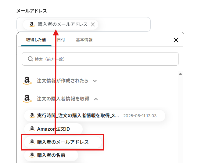 「メールアドレス」は、入力欄をクリックして表示される取得した値から選択してください。