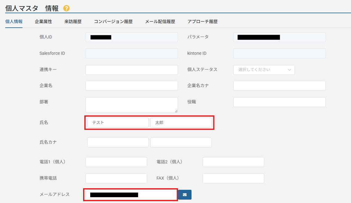 設定完了後は「テスト」を行い、実際にList Finderに個人マスタ情報が登録されることを確認してください。