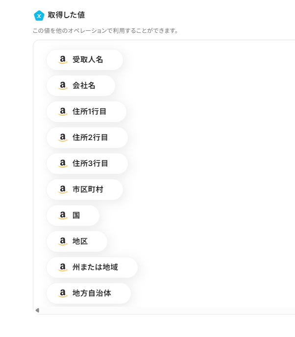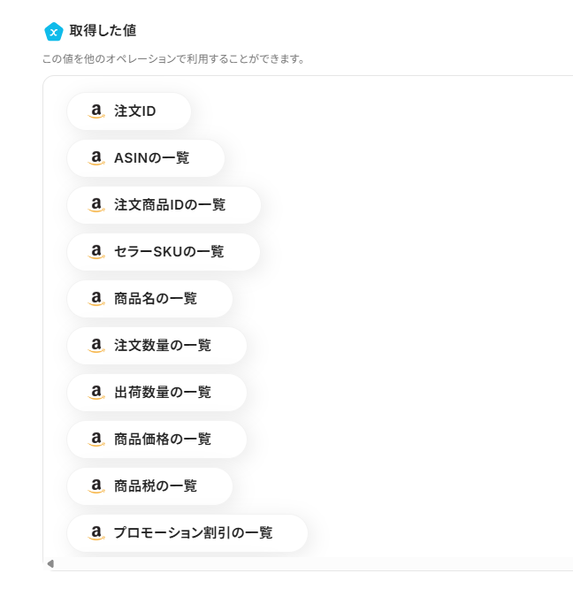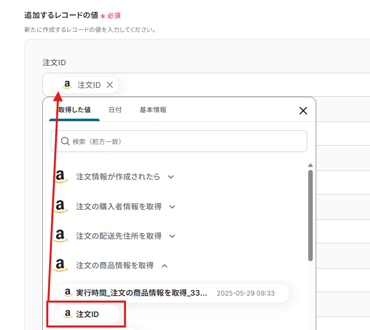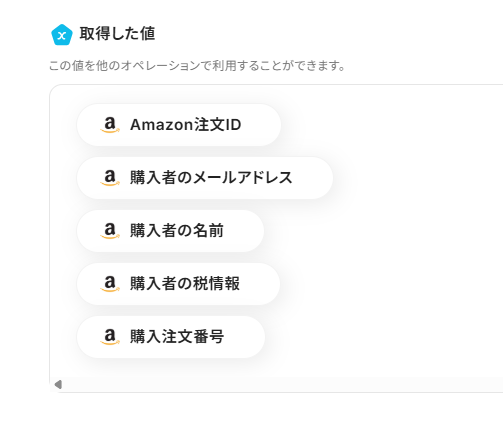 Google スプレッドシートの「レコードを追加する」オペレーションでは、Amazon Seller Centralから取得した注文情報(購入者情報、配送先住所、商品情報など)を、Google スプレッドシートのどの列(ヘッダ)に格納するかを自由に設定できます。これにより、既存の管理表のフォーマットに合わせて情報を整理することが可能です。 ■注意事項
