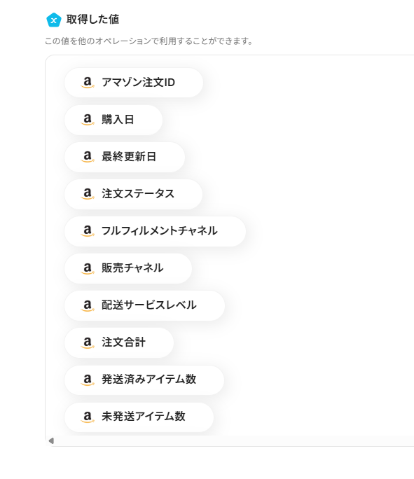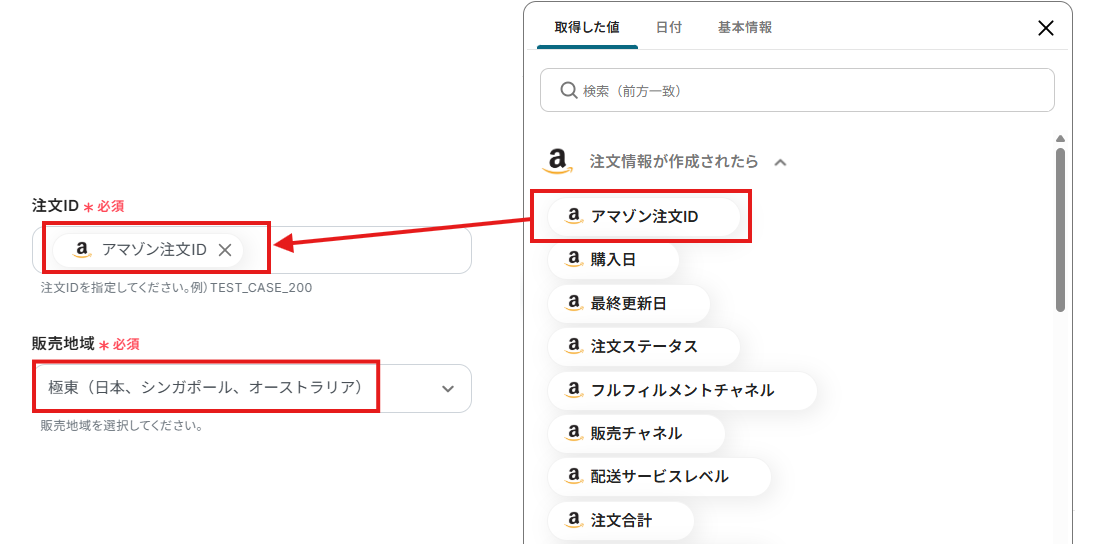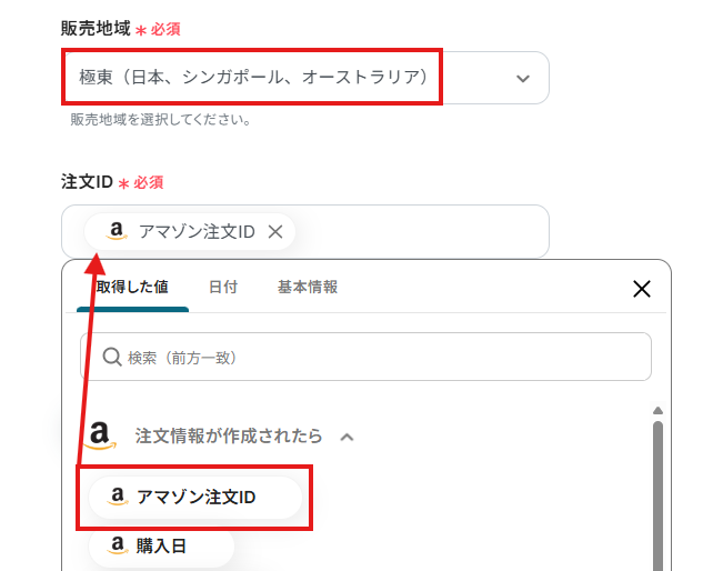 「注文ID」は、入力欄をクリックして表示されるアウトプット(取得した値)から選択してください。