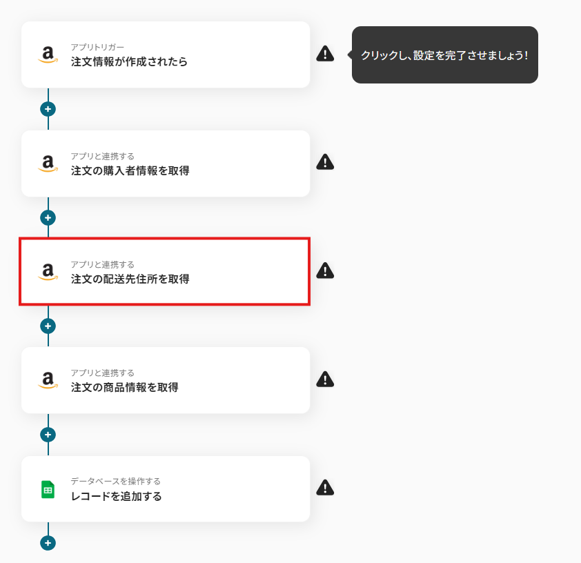 1.アプリと連携する「注文の配送先住所を取得」をクリックしましょう。