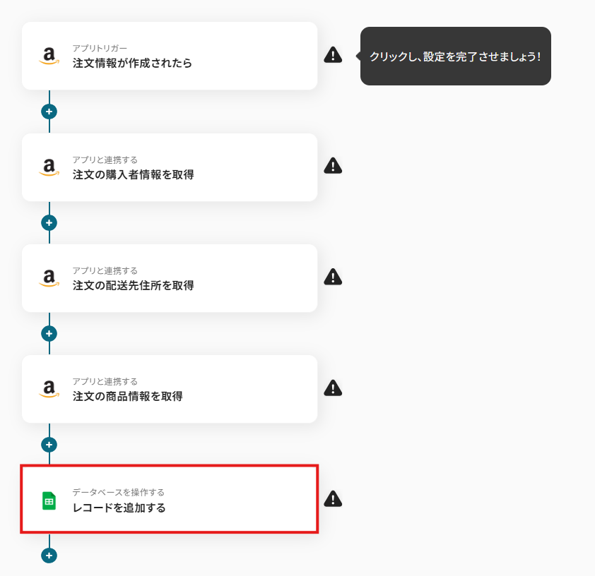 はじめに、Amazon Seller CentralとGoogle スプレッドシートをYoomと連携します。 次に、トリガーでAmazon Seller Centralを選択し、「注文情報が作成されたら」というアクションを設定します。 次に、オペレーションでAmazon Seller Centralの「注文の購入者情報を取得する」アクションを設定します。 続けて、オペレーションでAmazon Seller Centralの「注文の配送先住所を取得する」アクションを設定します。 さらに、オペレーションでAmazon Seller Centralの「注文の商品情報を取得する」アクションを設定します。 最後に、オペレーションでGoogle スプレッドシートの「レコードを追加する」アクションを設定し、取得した注文情報を指定のスプレッドシートに追加します。 ※「トリガー」:フロー起動のきっかけとなるアクション、「オペレーション」:トリガー起動後、フロー内で処理を行うアクション