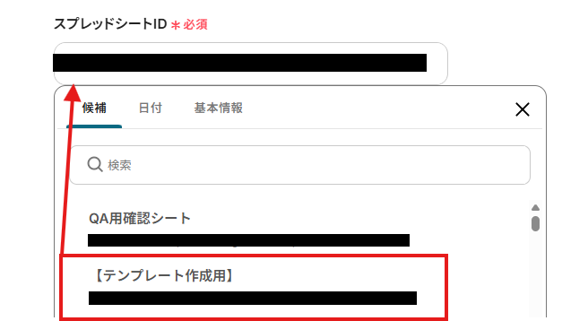 「スプレッドシートID」「スプレッドシートのタブ名」は、事前に作成したGoogle スプレッドシートを、入力欄をクリックして表示される候補から選択するか、入力欄下の説明に従って、入力してください。