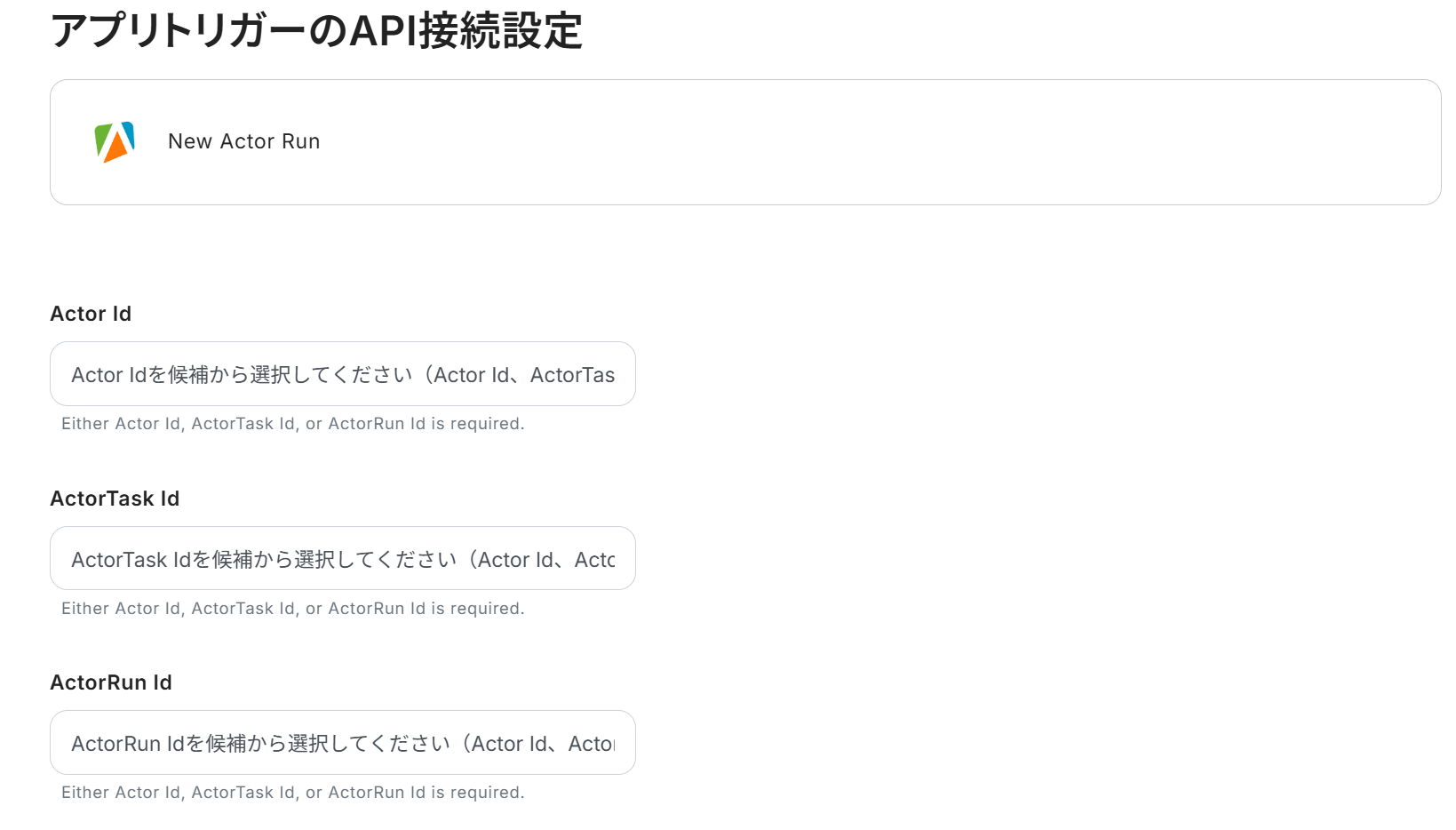 Actor Id、ActorTask Id、または ActorRun Id のいずれかが必要です。