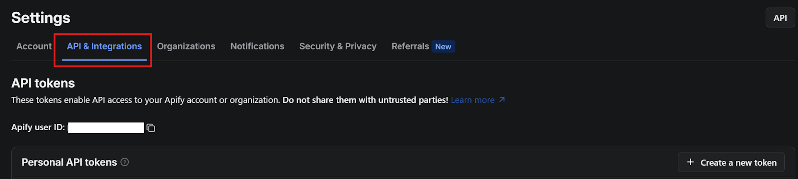 3.API & IntegrationsからAPI Tokenを取得しましょう。