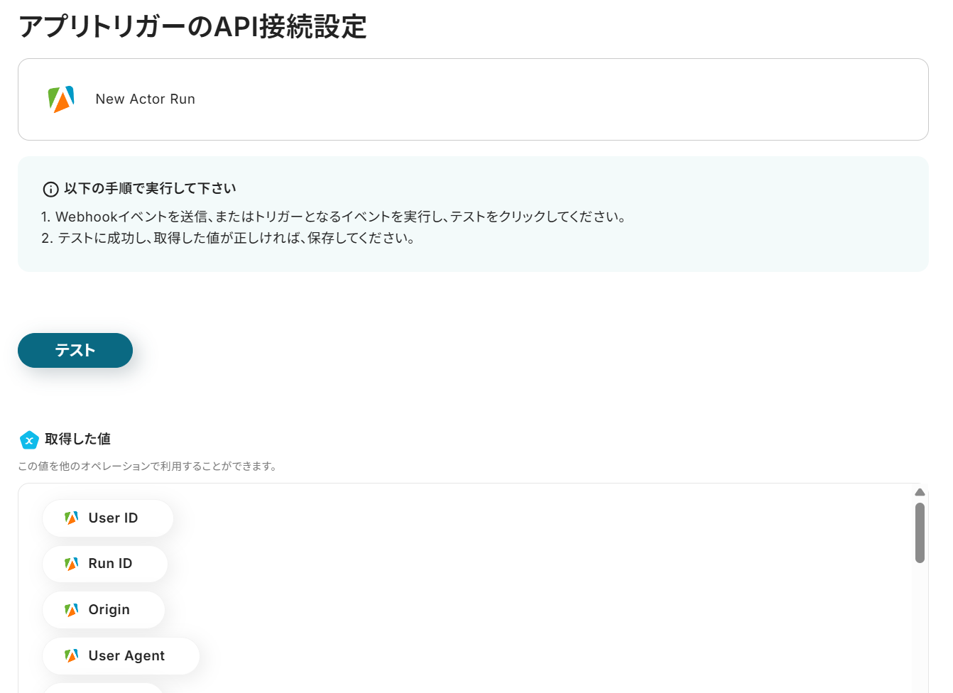 ここで、テストをする前にApifyの画面でActorを「Run」または「Re-run」してください。