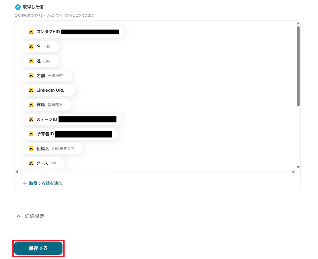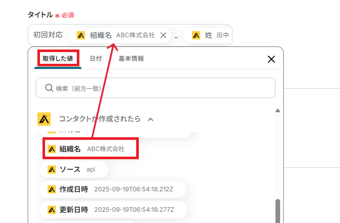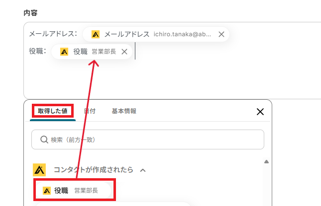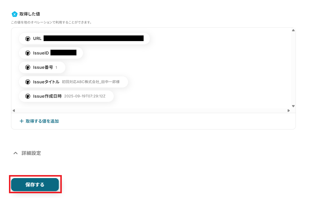 トリガーアクションのテストで取得した値の中に、任意のカスタムフィールドの情報を追加しておくことで、後続オペレーションでカスタムフィールドの情報を活用できます。