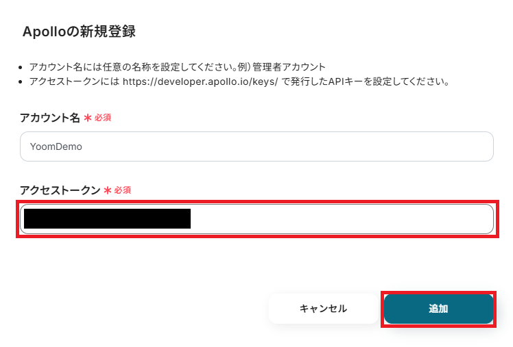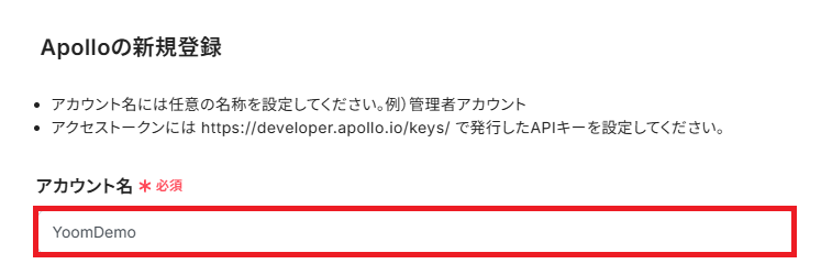 「アクセストークン」は、Apolloから取得できるAPI keyを設定します。