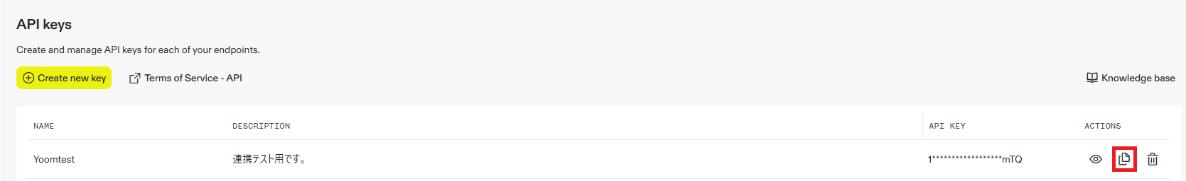 API keysの一覧に新しいAPIが追加されるので、発行されたAPI keyをコピーしましょう。