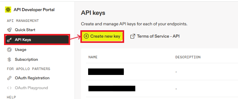 Apolloにログインし、設定画面の「API keys」から「Create new key」を押してください。