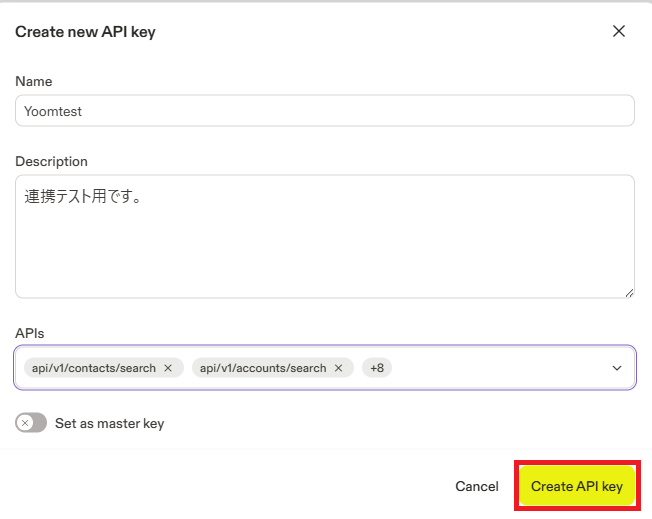 Yoomのアプリ連携画面に戻り、先ほどコピーしたAPI keyを「アクセストークン」欄に入力してください。