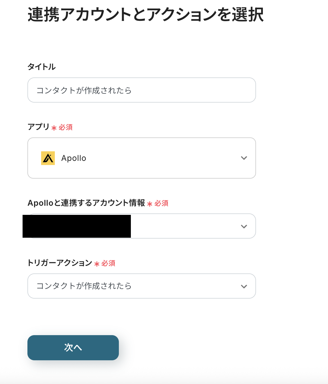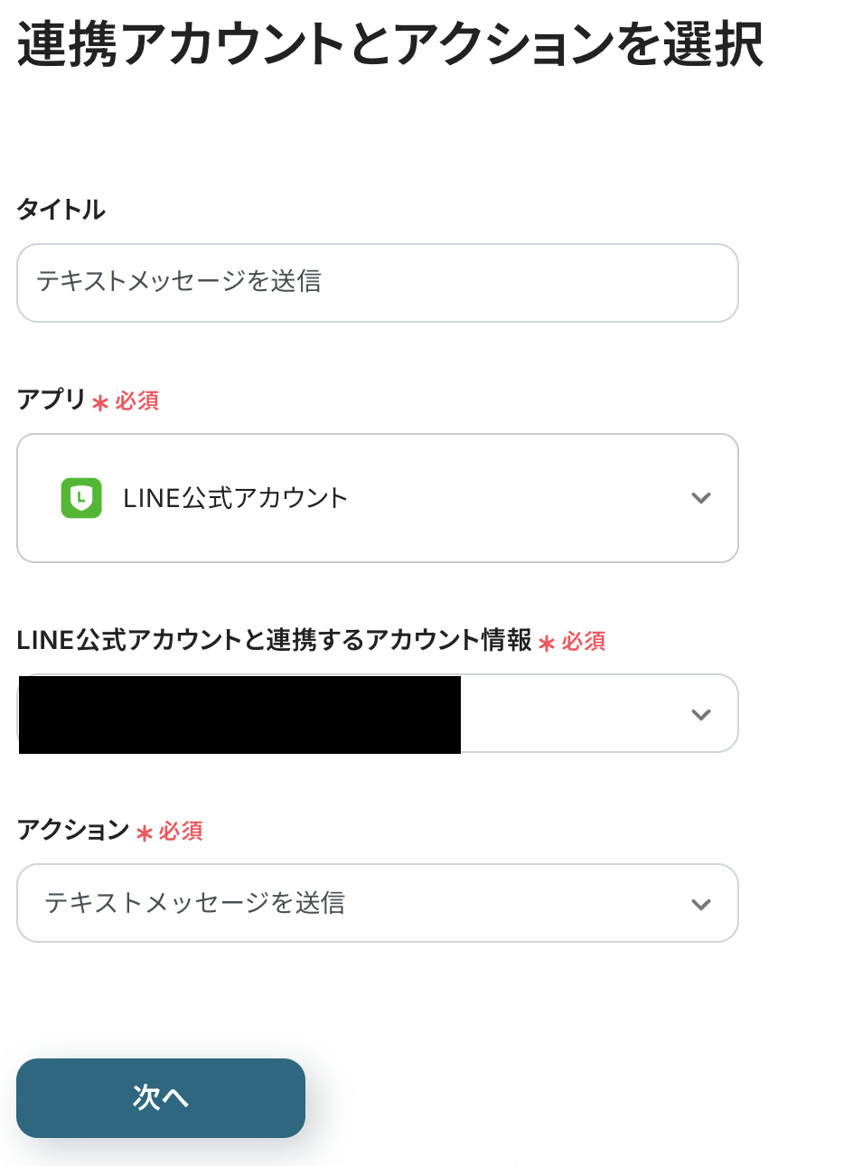 連携アカウントとアクションを選択の画面は、以下を確認し、次へをクリックしてください。