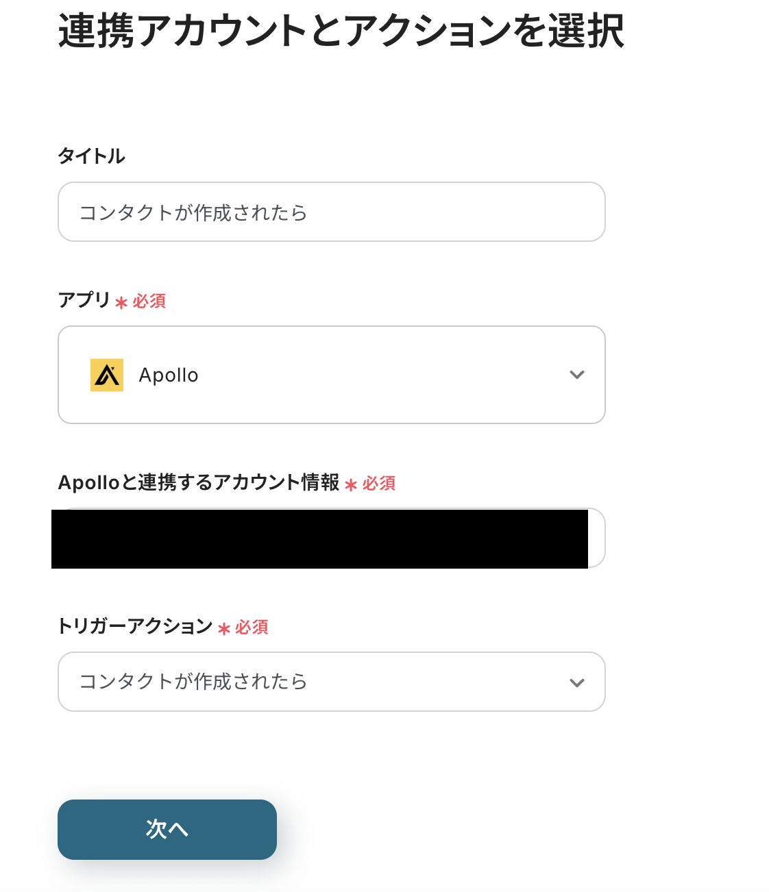 連携アカウントとアクションを選択の画面は、以下を確認し、次へをクリックしましょう。