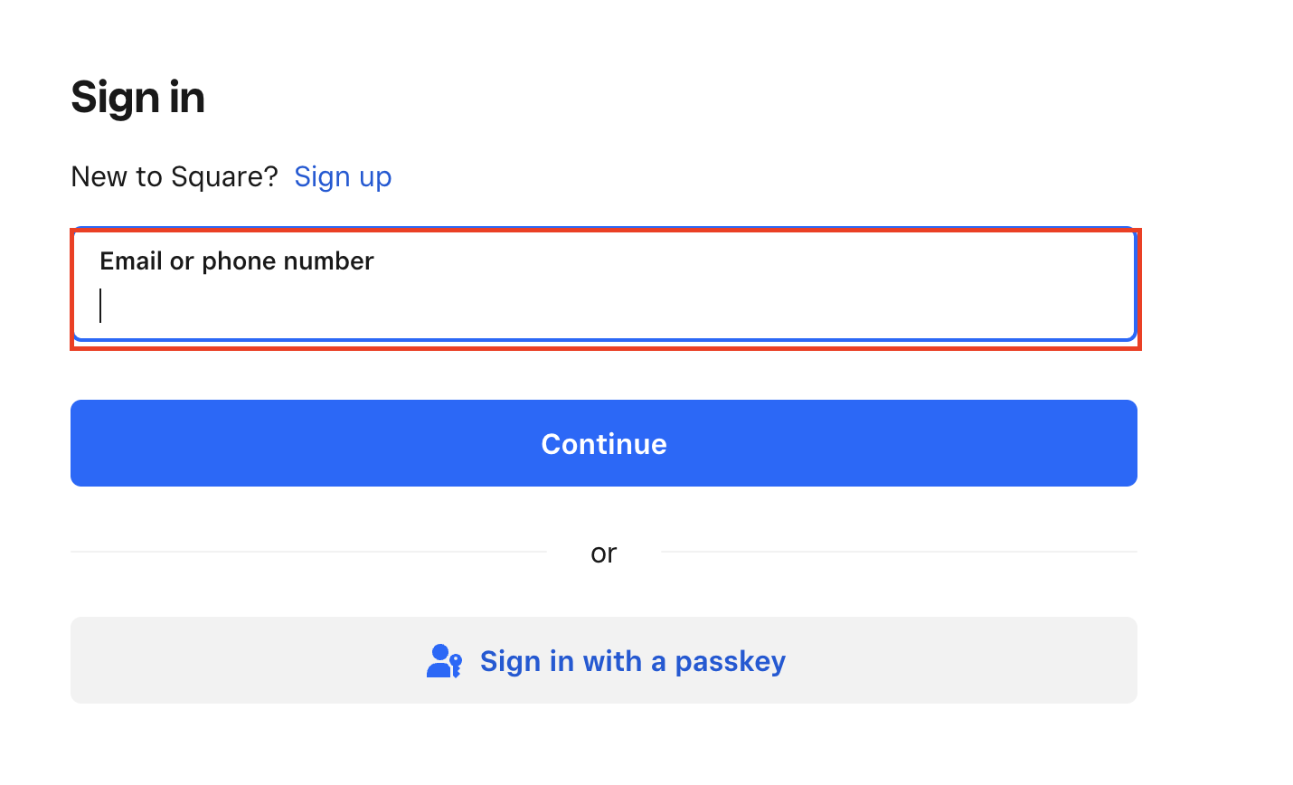 Squareのログイン画面に移行したら、登録しているメールアドレスか電話番号を入力します。