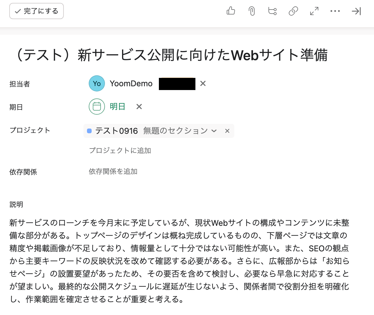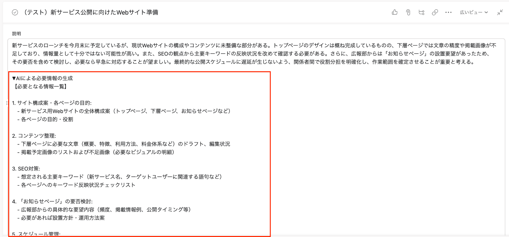 このテンプレートを使えば、タスクが作成されると同時にAIがタスク名に基づいて関連情報を自動で生成し追記するため、手作業による情報追記の手間を完全になくし、タスク内容の品質を常に高いレベルで均一化できます。