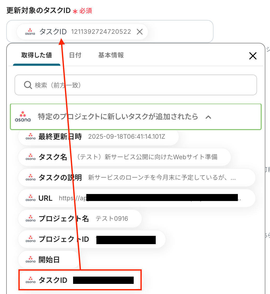 「更新対象のタスクID」:入力欄をクリックして表示される取得した値を引用して設定してください。